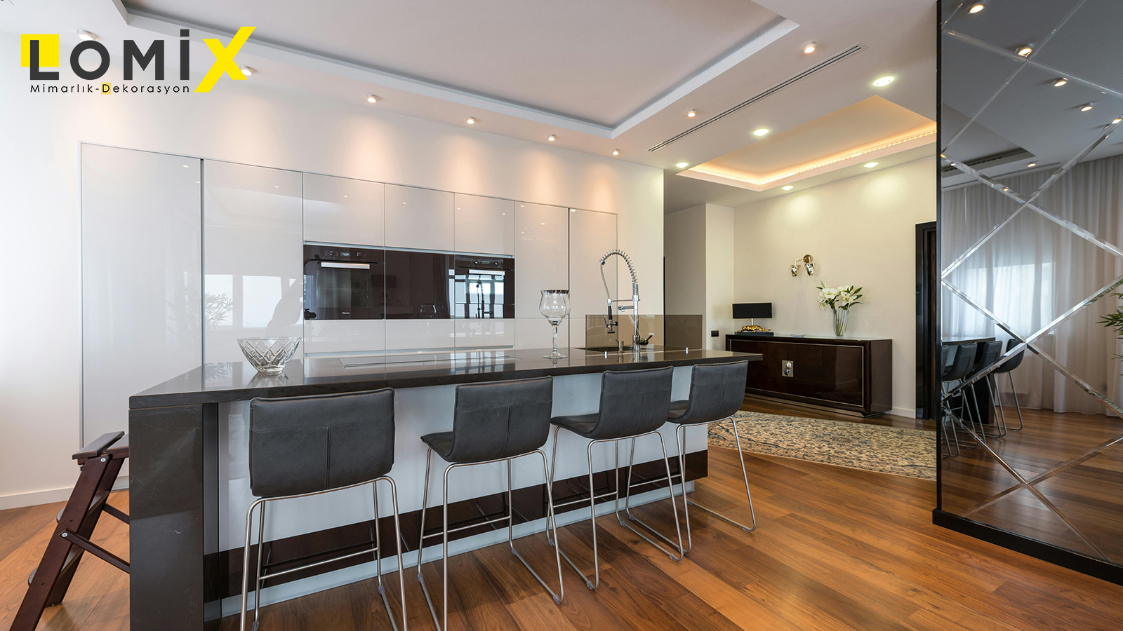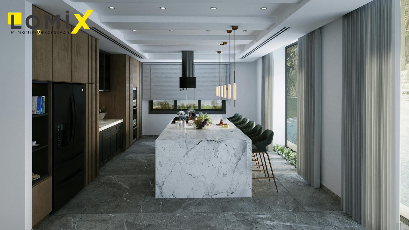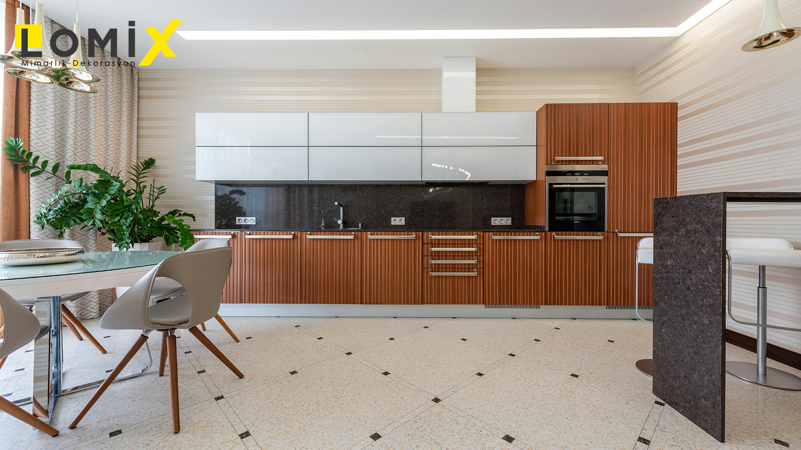 Mutfak dekorasyonu, hem işlevselliğin hem de estetik görünümün en önemli olduğu alanlardan biridir. Lomix olarak mutfak tasarımlarında, kullanıcının ihtiyaçlarını merkeze alarak çalışma üçgeni, depolama kapasitesi, tezgâh alanı ve ergonomiyi en verimli şekilde planlıyoruz.